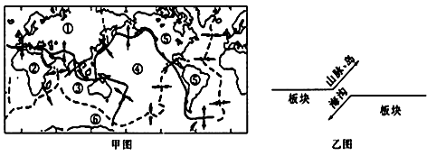 3、单选题 读板块分布示意图(甲图)及板块碰撞示意图(乙图),回答下面问题。