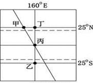 【小题1】因为甲、丙在晨线上,则甲、丙的右侧为白昼,北半球昼长夜短,太阳直射点在北半球;太阳直射点所在的经线为正午12点。图中晨线与赤道的交点在160°E上,则160°E为6点。据此可判断110°W为12点;故选D。