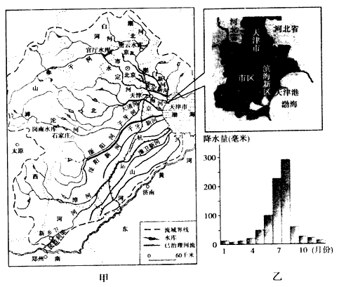 5、综合题 图甲为“海河流域示意图”,图乙为“海河流域全年各月降水量分配图”,读图回答