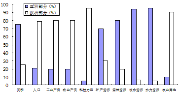 (3)优势条件:面积广大(1分);自然资源丰富(1分,具体答也可以);劣势条件:人口少;气候严寒;农业用地不足;科技力量薄弱;开发历史短。(任选2项得2分)(共4分)