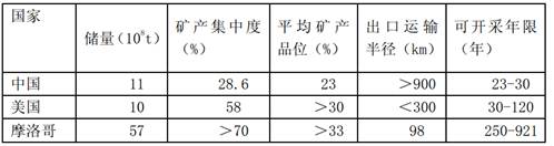材料二:中国、美国、摩洛哥三国磷矿资源综合比较(出口运输半径:矿产地离最近港口距离;矿产品位:指金属矿床和部分非金属矿床中有用组分的富集程度及单位含量。)