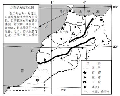 (1)摩洛哥毗邻撒哈拉沙漠,但却有“烈日下的清凉国土”的美誉,主要是该国大部分地区因为____________的影响很少受到南方沙漠热浪的袭击。从空间上看,摩洛哥城市主要分布在____________部地区,影响其分布的主要自然因素是____________。(6分) (2)甲、乙两地易产生水土流失的是____________,该环境问题出现频率最多的季节是____________。(4分) (3)摩洛哥磷矿出口在国际市场上的竞争优势是____________、____________。(4分) (4)从气候和地形的角度,分析该国为合理利用水资源重视水利工程建设的原因。(6分) (5)分析丹吉尔免税工业园布局的有利区位因素。(8分)
