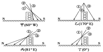 A.甲地一年中正午太阳高度变化幅度最大 B.乙地自转速度最小 C.丙地一年中昼夜长短变化大与丁地 D.丁地位于甲地的东南方向 |