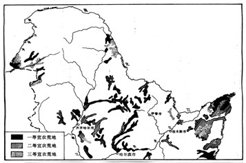 4、单选题 图为我国东北宜农荒地分布示意图。读图完成以下各题。1.该地区农业生产的突出优势资源是2.该地区降水分布规律是3.该地区土壤肥力下降,行之有效的整治措施是A.光照充足B.土壤肥沃C.降水丰沛D.物种丰富E.由东南向西北减少F.由东向西减少G.由北向南减少H.由西向东减少I.减少湿地开垦G.增施有机肥料调整产业结构建设农林基地
