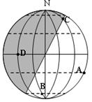 5、综合题 读某一时刻的地球光照图,阴影部分表示夜半球,回答下列问题。(每空1分,共10分)