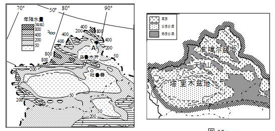 差异的成因,从图9可以分析出来。图9中,准噶尔盆地西部降水较多,因为西部山地多缺口,易受来自大西洋和北冰洋水汽影响,在地形强烈抬升作用下,降水较多,所以草原分布广;图9中,可以看到塔里木盆地降水很少,那是因为塔里木盆地地形封闭,来自大西洋和北冰洋水汽难以进入,影响小,导致降水稀少,所以中部多分布沙质沙漠;在塔里木盆地周围有冰雪融水,所以盆地周围分布着草原。