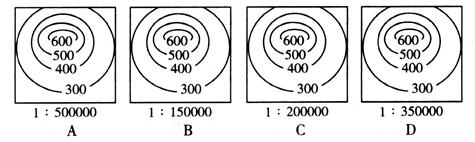小题2:下列等高线地形图中等高距不同,坡度相同,则四幅等高线(单位:米)地形图中,比例尺最大的是?