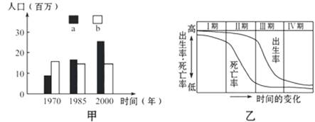 5、单选题 甲为世界两城市的人口增长情况图,乙为人口的增长模式图,读图回答问题。
