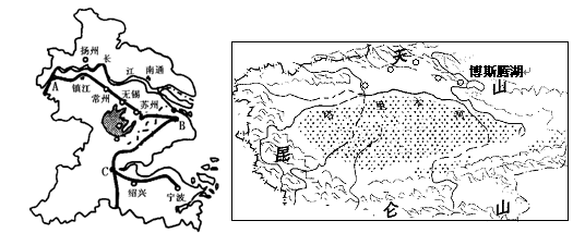 5、综合题 读长江三角洲地区图和新疆南部地区图,完成下列各题。(6分)