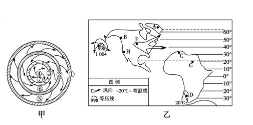 (3)图乙中H地与A、B、C、D四地中 的气候类型相同,成因是受图甲中 和 (填序号)交替控制。