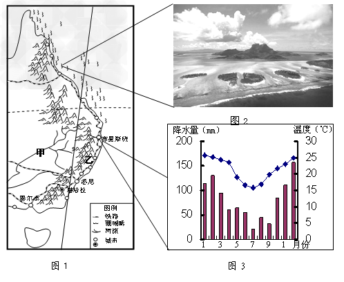 4、综合题 图1是世界某区域示意图,图2和图3分别是对应区域的景观和气候资料,据此完成下列问题。