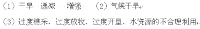 本题解析: (1)我国西北地区深居大陆内部,离海洋比较远,而大陆上的降水绝大部分来自海洋,海陆间的水分交换从沿海到内陆逐渐减弱。所以我国西北地区最显著的自然特征是干旱。降水自东向西逐渐减少,干旱程度逐渐增强。 (2)西北地区的气候干旱,降水稀少,决定了西北是我国生态环境最脆弱的地区。 (3)土地荒漠化是由人为原因和自然原因综合作用,自然因素主要是指异常的气候条件,特别是严重的干旱条件,由此造成植被退化,风蚀加快,引起荒漠化。人为因素主要指过度放牧、乱砍滥伐、开垦草地并进行连续耕作等,由此造成植被破坏,地表裸露,加快风蚀或雨蚀。 点评:注意题中(3)虽然问的是人为原因,但是也要了解自然因素。