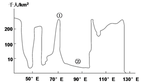 1、单选题 读“某大洲沿30°纬线人口密度图”,回答问题。