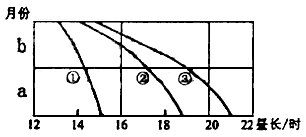1、若此图表示南半球三地的白昼变化,则a、b两月分别是