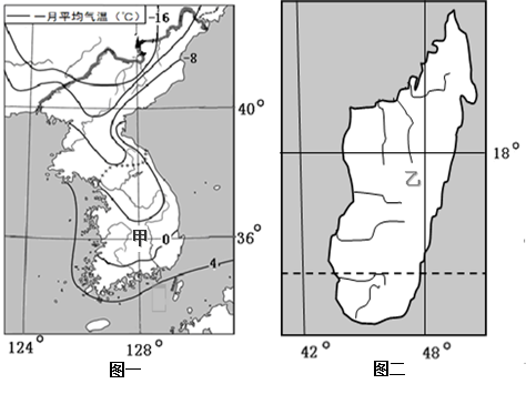 本题解析:第(1)题,图一所示半岛为朝鲜半岛,根据海陆位置和纬度位置判断该岛分布有亚热带季风气候与温带季风气候,其成因与海陆热力性质差异有关,气候类型分布呈南北更替与所跨纬度范围广有关。图二所示岛屿为马达加斯加岛,气候类型为热带草原气候与热带雨林气候,气候类型分布呈东西更替,与东南信风和地形有关。