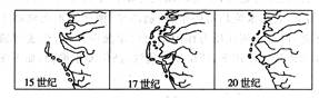1.根据图示判断河流入海口地区的面积不断扩大,故可判断为河流入海口地区泥沙淤积而导致了海岸线向海洋一侧推移。
