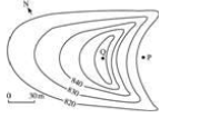3、单选题  图中等高线表示一种风力堆积的地表形态。据此完成小题