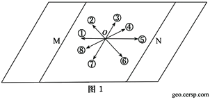 4、单选题 图1示意某一等高面。M、N为等压线,其气压值分别为PM、PN,M、N之间的气压梯度相同。①~⑧是只考虑水平受力,不计空气垂直运动时,O点空气运动的可能方向。回答4-6题。