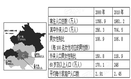 小题2:根据北京常住人口总数判断,10年内人口增加约600万,其中外来人口增加约450万,自然增长人口约150万,所以人口自然增长速度较慢;表格中60岁以上人口的比重超过10%,且10年内有所增长,所以人口老龄化严重,社会养老的负担加重;外来人口男女性别比下降,说明外来人口男性比例下降;外来人口迁入北京主要以青壮年为主,人口老龄化的主要与自然增长率低,平均寿命延长有关。所以本题选择B选项。