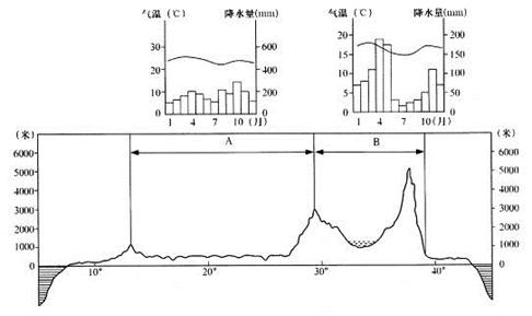 (1)根据图中数据,分析A、B两地区的气候特征,并说明形成原因。(6分)