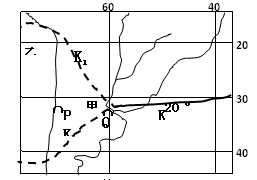 参考答案:(1)K1? 20?C等温线西半段由于受山地和寒流的影响,气温较低,等温线向低纬弯曲。(4分)? (2)气候温暖,地势平坦开阔,地下水丰富,草原广阔,草类茂盛。地广人稀,土地的租金低,机械化水平高,交通便利,市场广阔。?(3分) (3)P地夏季受副热带高压控制,炎热少雨。冬季受西风控制温和多雨。 (3分)