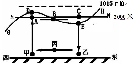 小题1:图中A、B、C、D、E五处,气压相等的是_________三处;气压最高的是______处;气压最低的是_____处。 小题2:甲乙两处冷热不均,甲、乙两处中受热的是?处,冷却的是?处。 假若此时地球位于远日点附近,则甲、乙两处中的________处位于海洋。 小题3:在近地面,甲处气压比乙处_____,丙处实际风向是刮______风。 小题4:若此图是城市和郊区之间的环流侧视图,则?处是城市中心。若丙处为绿地,则通过此环流对城市空气起到的作用是?(选择填空) A.净化.增湿 B.增温.增湿 C.减湿.减温 D.净化.增温