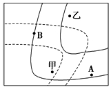 | 小题2:若等压线如图中实线所示时,乙处气压低于甲地,由A、B两地相比 A.A处气温低,气压高? B.B处气温低,气压低 C.A处出现降水的概率较大? D.B处可能出现阴雨天气