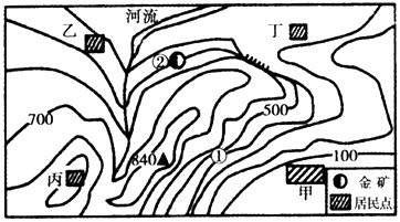 1、关于图中所反映信息表述正确的是 [? ] A、图中河流的流向为从东北流向西南后再向南 B、陡崖的相对高度为大于400米,小于600米 C、①地位于山地的迎风坡,降水比②地多 D、甲丙两地一年四季都能看到海上日出 2、为发展旅游业,该地区打算修一条直达山顶(840m处)的观光索道,合适的选线是 [? ] A、从甲处到山顶 B、从乙处到山顶 C、从丙处到山顶 D、从丁处到山顶 3、为保护生态环境,促进该地区的可持续发展,下列措施正确的是 [? ] A、①地区利用地形发展梯田,增加粮食种植面积 B、②地区开发金矿资源,大力发展有色冶金工业 C、甲地区可发展观光农业,开发生态农业旅游 D、丁地区建一个以观瀑布为主题的公园,发展旅游业