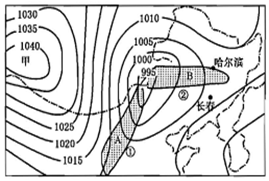 (1)图中甲、乙两处,_____ 为高气压中心,按天气系统的气流状况划分属于_____ ,图中乙处中心垂直方向气流运动状况为 _____ (填“上升”或“下沉”)。