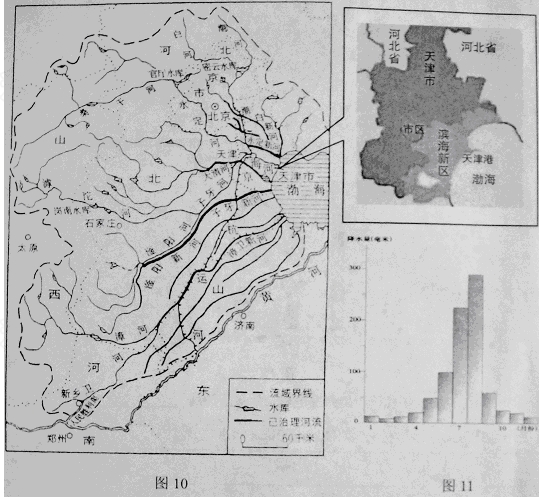 3、综合题 28.图10为“海河流域示意图”,图11为“海河流域全年各月降水量分配图”,读图回答下列问题。(15分)?(1)分析该河流的水系水文特征。