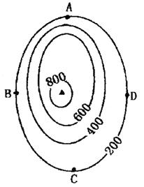 3、单选题 读图,从山峰向下望,将不能看见哪一点(?)