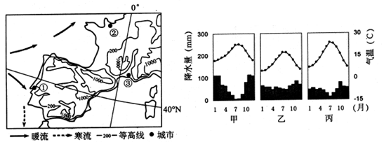 小题1:读图,根据纬度位置和海陆位置判断,①位于30°-40°的大陆西岸,属于地中海气候,位于迎风坡,降水较多,与右图中的甲对应。②是温带海洋性气候,全年各月降水均匀,与乙对应。③也是地中海气候,但根据等高线判断,位于山地背风坡,降水较少,与丙对应。所以A对。B、C、D错。