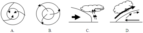 【小题1】气流过山时在②至③处成云致雨,水汽凝结需要释放热量,所以气温垂直递减率与山地其它处相比变小。所以本题选择D选项。