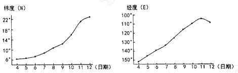 3、单选题 读2013年10月4-12日,某天气系统中心位置移动经纬度示意图。完成下列各题。
