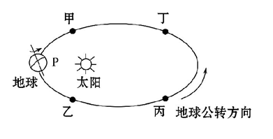 【小题1】从图中地轴倾斜方向可知,P位置太阳直射南回归线,为冬至日,甲、乙、丙、丁四点将地球公转轨道等分为四段,即任两点时间间隔约为3个月,根据地球运动的方向可知,乙点约为2月10日前后、丙点约为5月10日前后、丁点约为8月10日前后、甲点约为11月10日前后,因此,2015年2月19日最接近乙点。