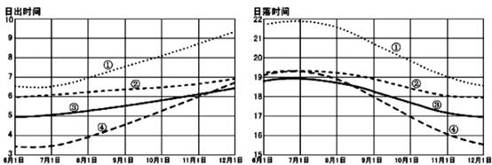 4、单选题 下图是我国四个城市半年的日出日落时间(北京时间)变化图,读图回答下列问题。 |