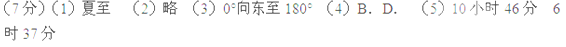 (5)若该日甲地(20°N,50°E)的昼长为13时14分,则乙地(20°S,130°W)的昼长为?,
