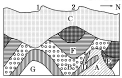 5、单选题 读某地地质剖面图,其中C为沉积物,B、F、G为沉积岩,A、D为不同时期的岩浆岩,而且该地没有发生过地层倒置现象。据此回答1—2题。