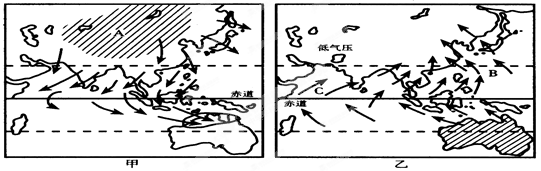 A.气温日较差一直在扩大 B.气温持续下降,空气的湿度不断增大 C.6、7日保温作用较强,气温升高 D.8、9日天气转晴,9日回暖 参考答案: 本题解析:本题考查天气系统和读图分析能力。 本题难度:一般 4、综合题 读“亚洲季风示意图”,回答问题。(8分) 参考答案:(1)一月?七月?(2)蒙古西伯利亚高压(亚洲高压)?副极地低气压带 本题解析:(1)甲图东亚盛行西北季风,故判断为北半球冬季;乙图东亚盛行东南季风,判断北半球夏季。(2)结合上题分析,冬季,亚欧大陆上形成高压中心,名称为亚洲高压;其切断了60°附近的副极地低压带。(3)图示B处为东亚的夏季风,其成因为海陆热力性质的差异。(4)C处为南亚的夏季风,且成因为气压带风带的季节移动。(5)季风气候的基本特征,雨热同期,夏季高温多雨,故利于农业生产。 本题难度:一般 5、综合题 (14分)结合图文材料,回答问题。 参考答案: 本题解析: 本题难度:一般 |
