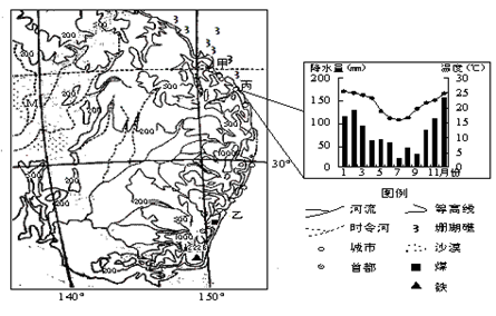 (2)从气候、地形、水文的角度,分析丙城市洪涝灾害多发的原因。(3分)