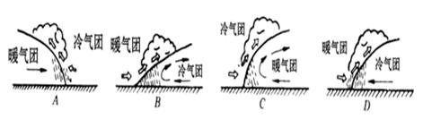 本题解析:暖锋是暖气团主动向冷气团移动而形成的锋。符合的是B。