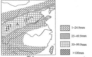 小题1:图示时期,华北地区降水较多,长江中下游地区降水少,所以,应该在七、八月份,长江为伏旱天气。