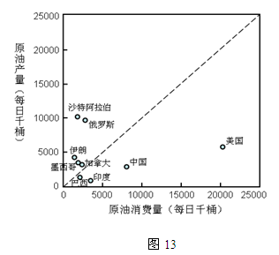 3、填空题 图13为“2007年部分国家石油产、消量统计示意图”,读图回答问题。