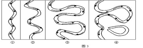 小题1:河流形成的早期,河岸比较平直,此时期的河流侧蚀比较明显。河流水在侧蚀过程中可能遇到河流两岸岩石软硬不同,较软的一岸侵蚀严重,逐渐形成凹岸,另一岸为凸岸。此后河流凹岸不断遭侵蚀,河流越来越弯曲(河道向凹岸一侧不断弯曲),河流弯曲到很大的程度后,通过自然裁弯取直或人工裁弯取直,废弃的河道形成牛轭湖。 故选D项。