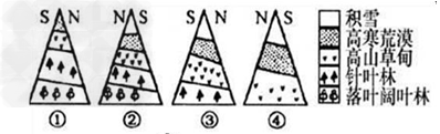 小题2:本题考查垂直自然带的分布。根据四处山地自然带的分布,根据山麓自然带判断①②纬度较低,③④纬度较高,;根据自然带的倾斜判断向阳坡,①③位于北半球,②④位于南半球。所以本题选择B选项。