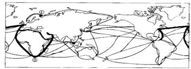 ![]() 2、单选题 材料一: 3、综合题 读“世界主要航海线和主要海港”示意图,完成下列要求:(16分) |
