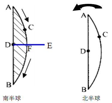 2.若图中AD线与DB线分属两根不同经线的一部分,ACB线为晨昏线的一部分,且A点地方时为6时,则B点的地方时为18点,A、B位于同一条纬线(0o)上,位置偏东的点时间较早,由于A、B经度差为180度,故图示地球自转可能为顺时针,也可能为逆时针,如下图所示,则D有可能位于南极点,也有可能位于北极点,不论图示位于南或北半球,南极附近都有极夜现象,北极附近都有极昼现象,太阳直射点在北半球,下图中DFE经线地方时为12:00,因此北半球盐城地区东北方向日出。