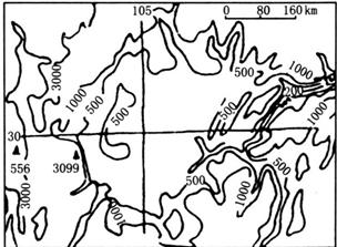 (2)该图东部等高线密集处是?地区,其形成原因是?。