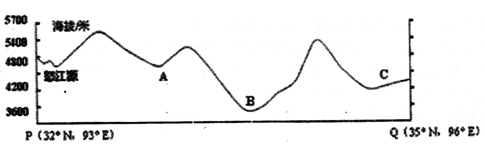 小题1:根据图中经纬度,该剖面线为自西南向东北,图中A为澜沧江,B为长江,C为黄河的河谷。长江年径流量占全国的1/3,水能资源为全国第一,BC之间为巴颜喀拉山。所以本题选择A选项。