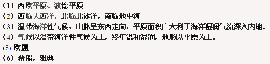 本题解析:本题考查世界区域地理。(1)图示为欧洲西部,著名的平原有西欧平原和中欧平原(即波德平原)。(2)海陆位置主要从三面环海和亚欧大陆中的位置分析。(3)本区受盛行西风和北大西洋暖流影响,气候类型为温带海洋性气候。地形对气候影响主要从平原广阔和山脉走向分析。(4)该地区受温带海洋性气候影响,气候温和湿润,不利于粮食作物的成熟,但利于牧草生长,且平原广阔,故乳畜业发达。(5)西欧著名的区域性国际组织为欧盟。(6)2004年夏奥会在希腊雅典举行。